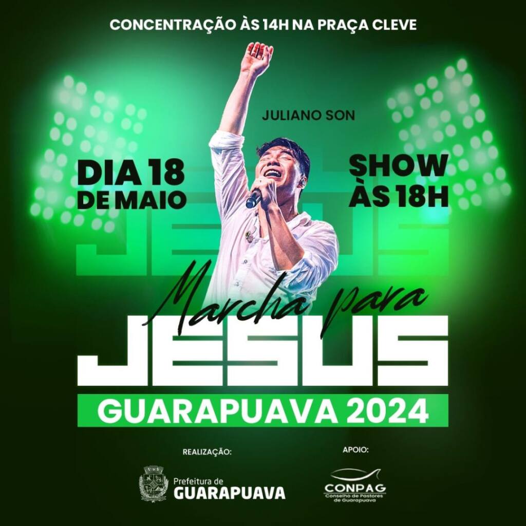 “A Marcha para Jesus completa 32 anos em 2024. A 14ª edição do maior evento cristão a céu aberto do mundo está marcada para o dia 18 de maio, às 14h, em Guarapuava. A caminhada sairá e será encerrada na Praça Cleve, e marcharemos em torno da nossa cidade. No local de chegada, será montada uma megaestrutura que receberá o pastor, compositor e cantor gospel, Juliano Son”, completou Vanderlei.