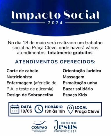 No mesmo local, entre às 13h e às 16h, será realizado um trabalho de Impacto Social, onde serão oferecidos atendimentos gratuitos de corte de cabelo, nutricionista, enfermagem (aferição de pressão arterial e teste de glicemia), design de sobrancelha, orientação jurídica, massagem, esmaltação de unha, bazar solidário e espaço kids.