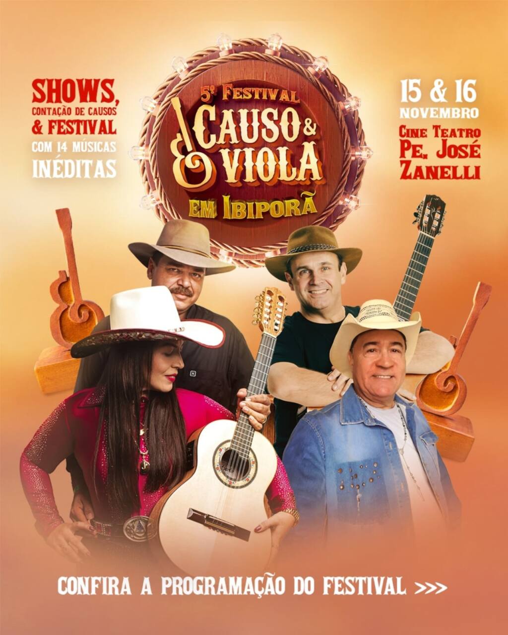 A quinta edição do Festival, que valoriza a cultura caipira de raiz, será neste fim de semana, dias 15 e 16 de novembro, no Cine Teatro Padre José Zanelli, em Ibiporã. Começa na sexta, dia 15, às 20h, com contação de causos, eliminatórias com os 14 semifinalistas do festival e um show imperdível com Juliana Andrade e Cleiton Torres! No Sábado, dia 16, às 20h: Contação de Causo com Duo Ninho de Histórias, a nossa grande final com os 7 finalistas do festival. Mais um show com Leandro Motta & Almir Salles e amigos em tributo ao nosso grande mestre Cleber Tóffoli. Confira a programação completa em: https://www.causoeviola.com.br/