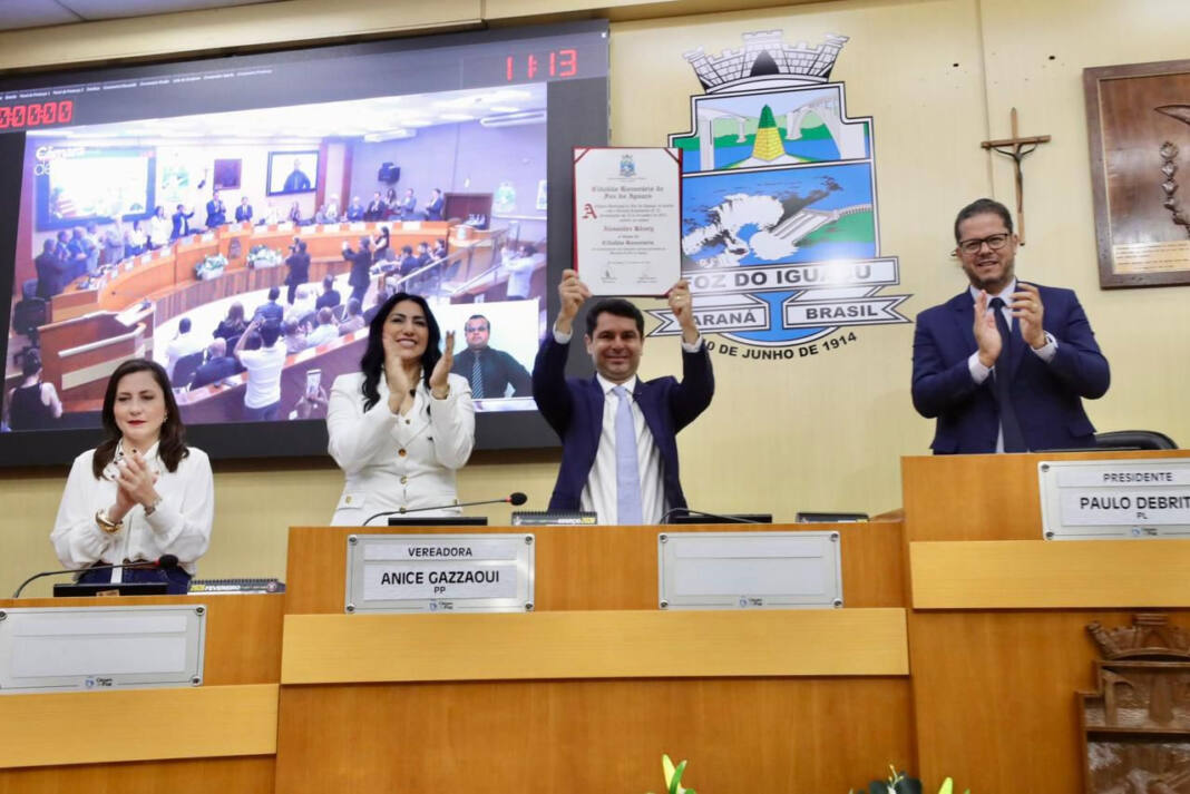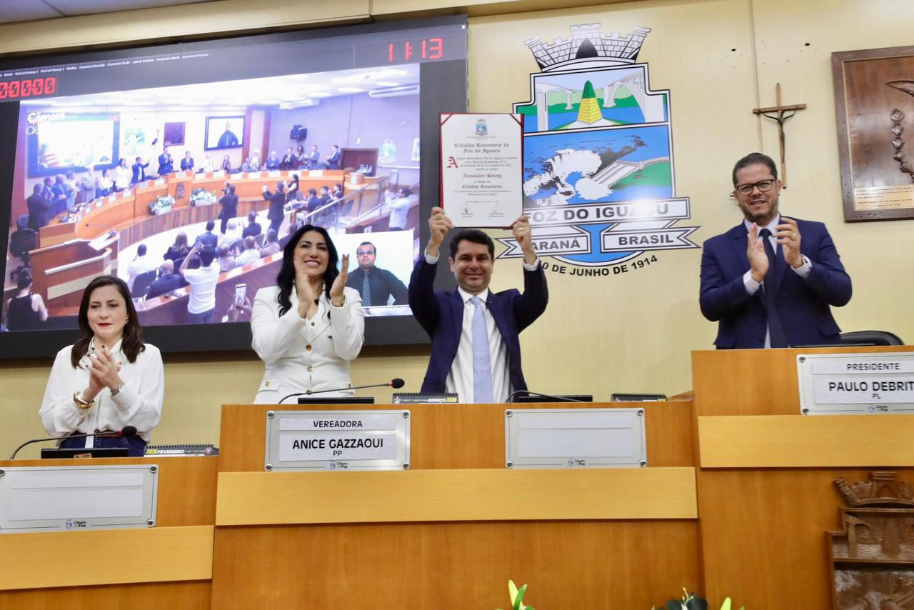 O deputado estadual Alexandre Curi (PSD), presidente da Assembleia Legislativa do Paraná, recebeu nesta sexta-feira (27) o título de Cidadão Honorário de Foz do Iguaçu, a mais alta honraria concedida pelo município. A solenidade foi realizada na Câmara Municipal e a homenagem foi proposta pela vereadora Anice Nagib Gazzaoui (PP) e aprovada por unanimidade pelos demais parlamentares.