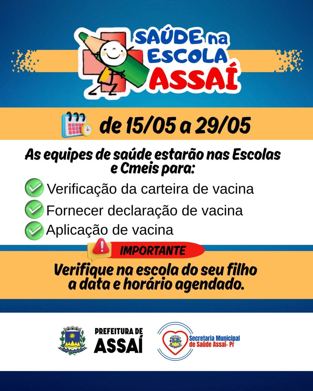 Ampliar os cuidados com a saúde dos estudantes de Assaí é uma meta do Prefeito Tuti Bomtempo, e através do Programa Saúde na Escola, os profissionais da Secretaria de Saúde estarão visitando as escolas e cmeis para: