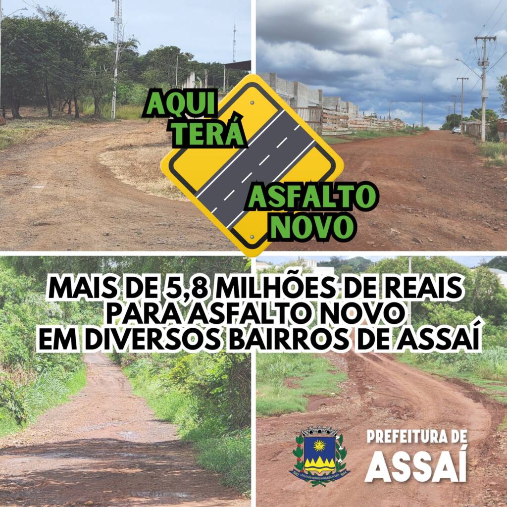A cidade de Assaí comemora mais uma grande conquista! O prefeito Tuti Bomtempo garantiu, junto ao Governo do Paraná, um investimento de mais de R$ 5,8 milhões para a pavimentação asfáltica de ruas em diversos bairros da cidade, incluindo Centro, Conjunto Eldorado, Vila Prudêncio, Conjunto Cotia e Copasa.