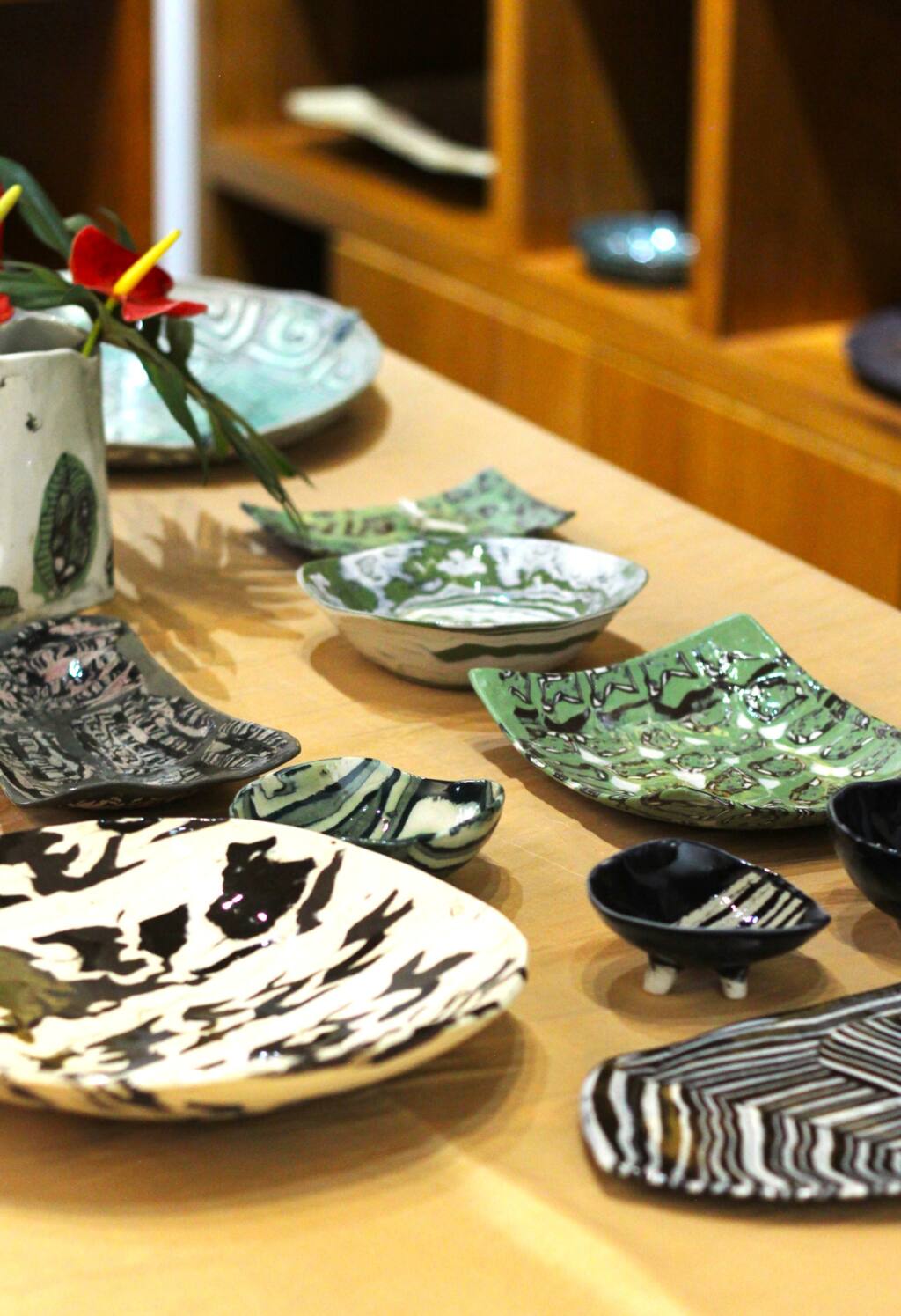 As peças em exposição e venda são de quatro ceramistas, cada uma com uma abordagem no trabalho com a argila. Margarida Zirknitzer mostra trabalhos com uso da técnica chinesa ancestral chamada Nerikomi, depois aprimorada pelos japoneses, e que mistura massa cerâmica branca com pigmento, criando desenhos ora orgânicos ora geométricos já na modelagem; Malu Gair traz peças de espessura de papel e muita delicadeza nas escolhas de seus esmaltes; Cynthia Queiroz apresenta peças feitas em placas e acordelado, fazendo da pintura sua marca registrada; e Angélica Marion Rosenthal, com enfoque em trabalho com o torno.