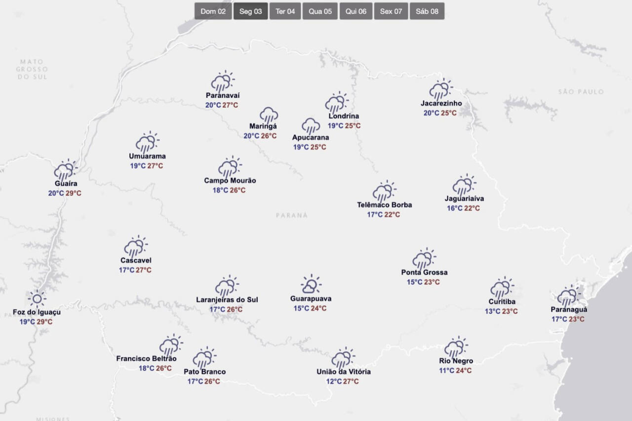 Apesar da chuva, as temperaturas permanecem elevadas, chegando perto dos 30°C no Oeste do Estado, especialmente em cidades como Altônia, Santa Helena e Foz do Iguaçu. Já no Leste, os valores são mais amenos, em torno dos 22°C.