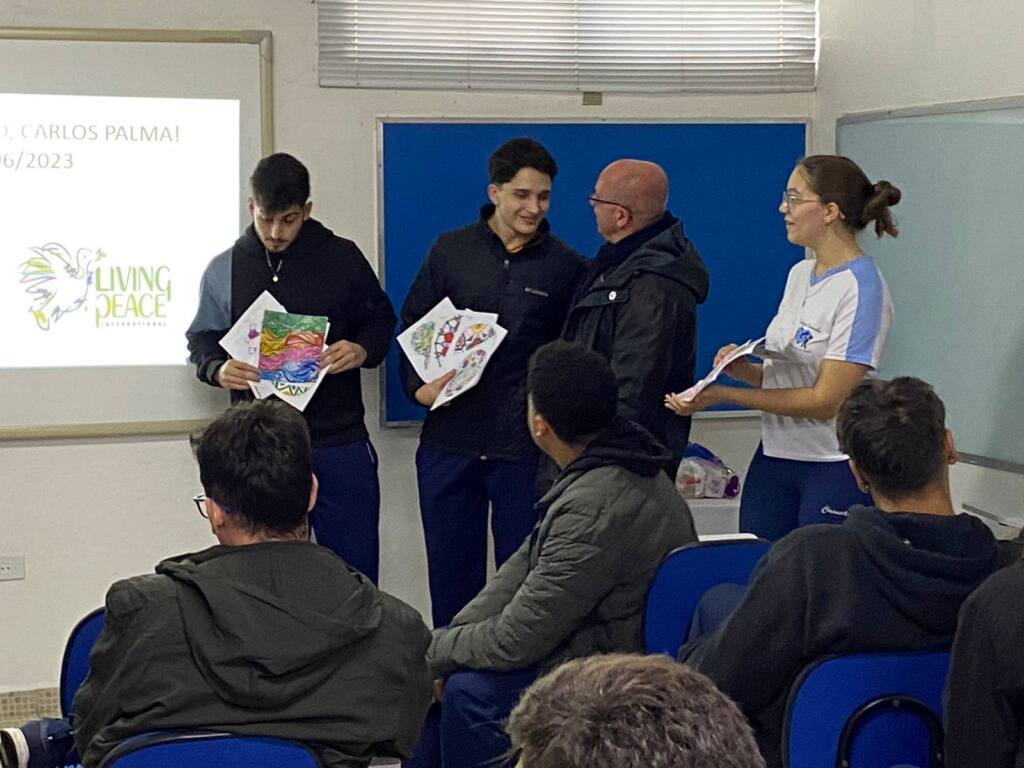 Carlos Palma esteve presente na a escola em diálogo com os alunos de duas turmas que já “vivem” o projeto, lançando o dado da paz e vivendo os valores de paz que nele estão escritos e fazendo o “Time out for Peace”, um minuto diário de reflexão ou oração pela paz, unino a muitas crianças, adolescentes, jovens e adultos de todo o planeta.
