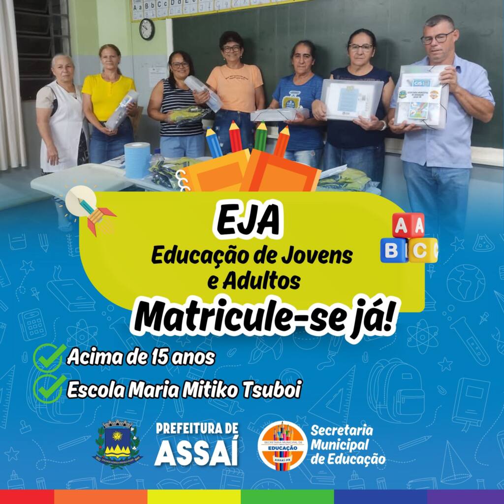 A Secretária de Educação Josiane Cheffer chama atenção da população para esta oportunidade “A EJA é uma grande oportunidade para quem não concluiu o ensino fundamental I (1º ao 5ºano) de voltar para a sala de aula e concluir a primeira etapa do ensino básico. Além do ensino de qualidade, a Prefeitura oferece toda a estrutura necessária para que os alunos tenham uma experiência completa na escola: material escolar, uniformes, alimentação e transporte. Esse é um compromisso e comprometimento do Prefeito Tuti Bomtempo com a educação de Assaí”.