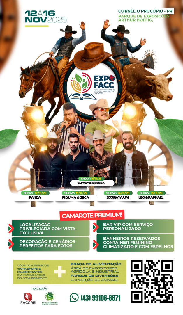 De 12 a 16 de novembro de 2025, o Parque de Exposições Arthur Hoffig, em Cornélio Procópio (PR), será o palco da EXPOFACC 2025 – Feira Multissetorial de Educação, Agronegócio e Inovação, evento que promete reunir negócios, conhecimento e grandes atrações culturais em uma das maiores edições já realizadas.
