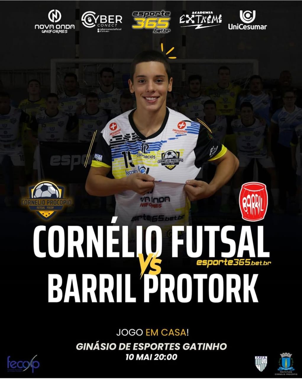 Neste sábado (data), a equipe do Cornélio Procópio Fecop Futsal entra em quadra para disputar sua terceira partida em casa pelo Campeonato Paranaense de Futsal Adulto – Série Bronze. O jogo será contra o Barril Protork, de Siqueira Campos, e está marcado para as 20h, no Ginásio de Esportes Gattinho.