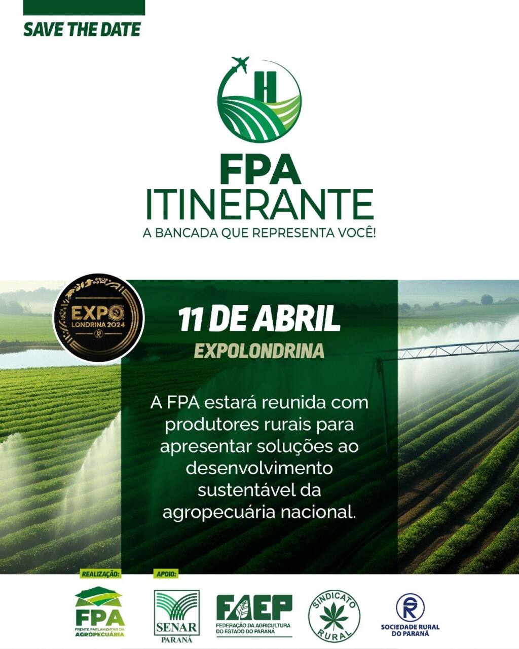 A Frente Parlamentar da Agropecuária (FPA) participa da EXPOLONDRINA 2024 a convite da Federação da Agricultura do Estado do Paraná (FAEP) e da Sociedade Rural do Paraná.