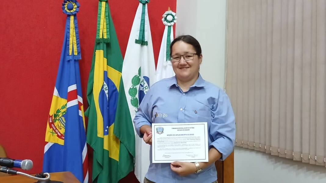 Carine Gonçalves, fundadora da ECOBIO – Assessoria e Consultoria Técnica de Extensão Ambiental, Educação, Infraestrutura Rural e Turística –, recebeu a Moção de Aplausos do Poder Legislativo Municipal de Nova Fátima (PR) em reconhecimento à sua atuação profissional e civil em todo território nacional e, especialmente, pelos relevantes serviços prestados ao seu município natal.