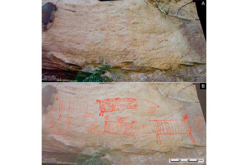 ARAUCÁRIA – No começo do ano, o Gupe já tinha anunciado a descoberta de registros de pinturas rupestres de araucária na região de Piraí do Sul. Foi a primeira vez que pesquisadores encontram a representação da árvore, símbolo do Paraná, registrada como pintura rupestre. Encontrado em setembro de 2021, o resultado do estudo foi publicado com o artigo “Primeiro registro de arte rupestre com representações de Araucaria angustifolia, Sul do Brasil”.