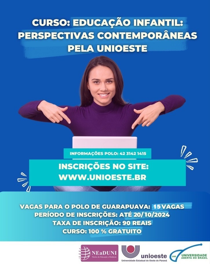 O Polo UAB de Guarapuava já está com inscrições abertas para a pós-graduação em Educação Infantil: Perspectivas Contemporâneas, da Unioeste, e para vagas remanescentes no curso de Letras – Licenciatura.
