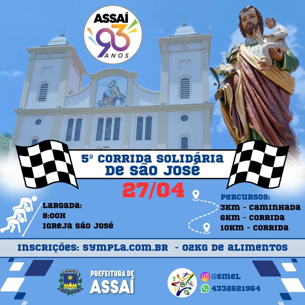 Dentro das comemorações dos 93 anos de Assaí, a Prefeitura Municipal, por meio da Secretaria de Esportes, convida você para a 5ª edição da Corrida Solidária de São José!