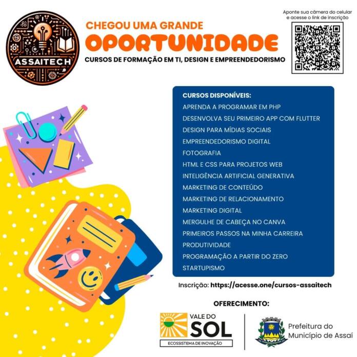 Atenção! Amanhã, 10 de abril, é o último dia para se inscrever nos cursos de formação oferecidos pelo Assaítech, da Agência de Inovação Vale do Sol!