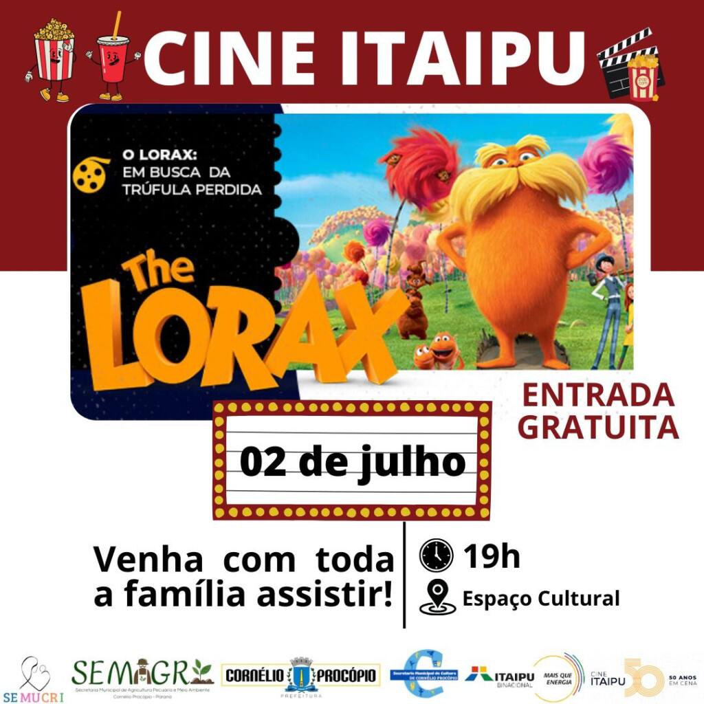 O município de Cornélio Procópio em parceria com o projeto Cine Itaipu 50 anos em cena, promoverá um cinema aberto ao público e totalmente gratuito que será realizado no espaço cultural no dia 02 de julho às 19 horas, contendo a abertura do projeto contextualizando a importância e o significado dessa celebração e em seguida a transmissão do filme principal “O Lorax: em busca da Trúfula Perdida”.