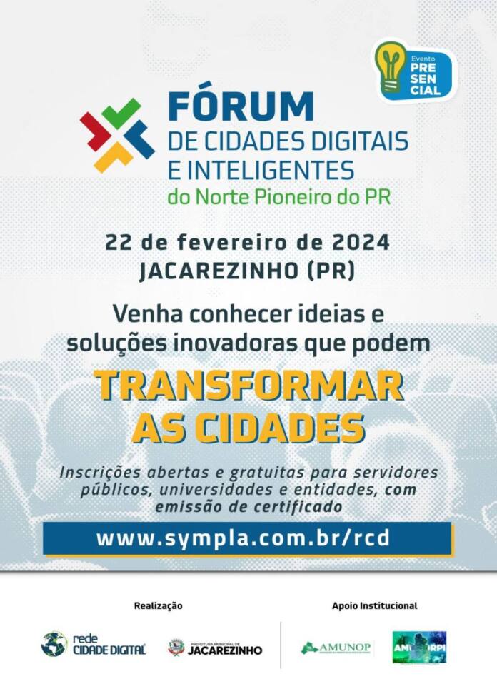 As inscrições para o Fórum de Cidades Digitais e Inteligentes do Norte Pioneiro do Paraná são gratuitas para servidores públicos, vereadores, entidades e universidades e devem ser feitas pelo sympla.com.br/rcd. As vagas são limitadas.