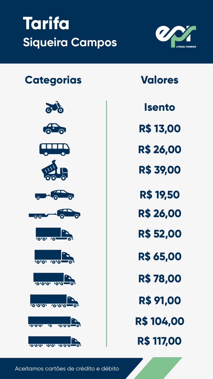 Na praça de pedágio de Siqueira Campos a redução na 30ª passagem é de 98%, com a primeira tarifa a R$ 12,35 e a trigésima cobrança de R$ 0,27. O valor médio pago nas 30 passagens pela praça é de R$ 3,26.