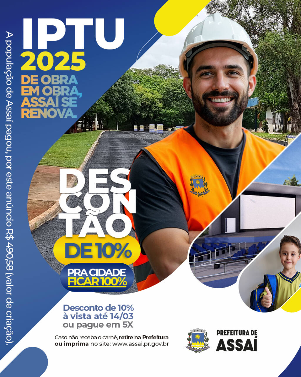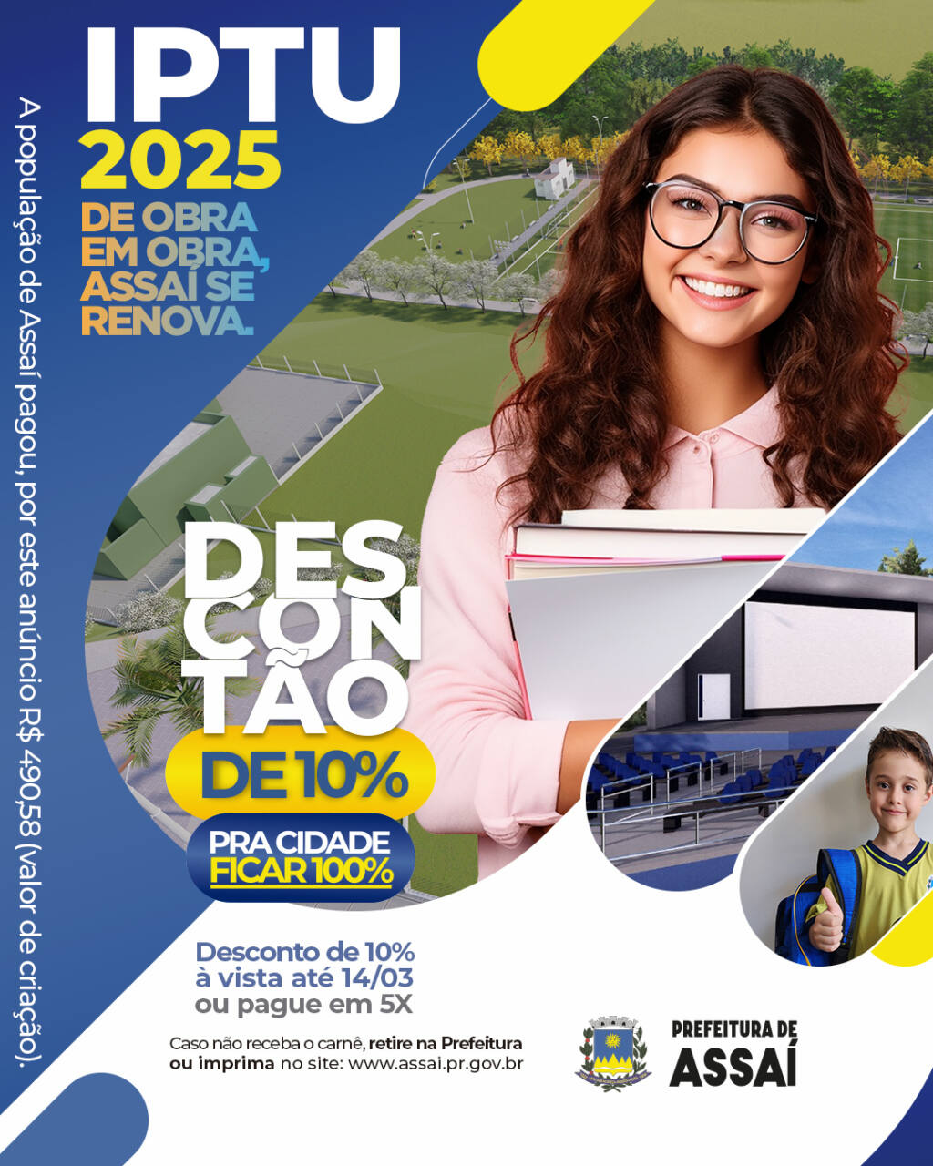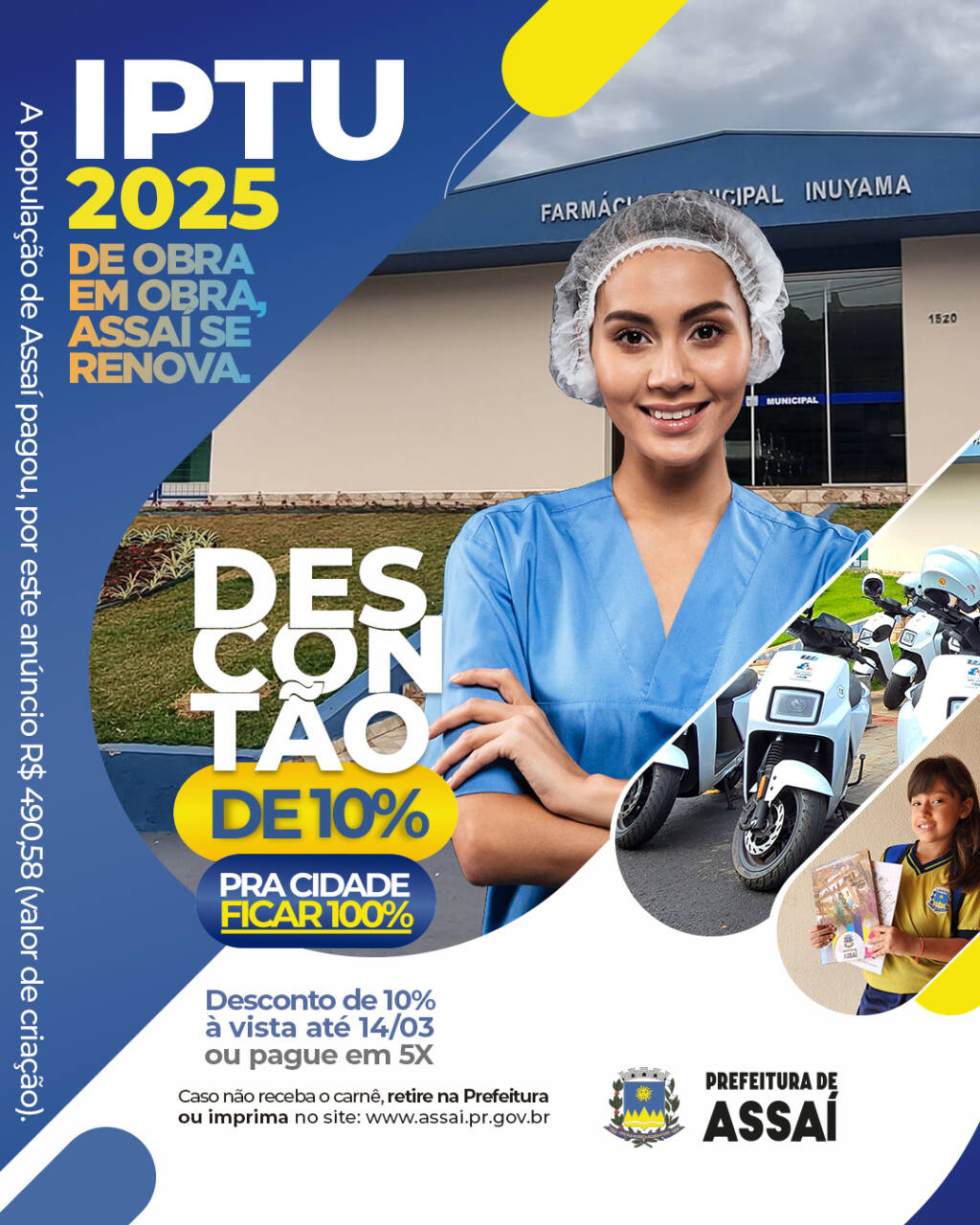 Os carnes serão entregues em sua casa, ou retire de forma online no site da Prefeitura www.assai.pr.gov.br , na aba Cidadão Web . Basta digitar o CPF do proprietário do imóvel e imprimir o carnê.