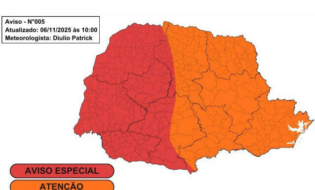A atualização da previsão indica riscomuito alto na metade Oeste do Estado e risco alto na metade Leste para ocorrências meteorológicas associadas à tempestades severas e chuva localmente intensa, com acumulados que podem ultrapassar pontualmente os 50 mm, descargas...