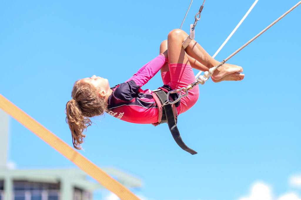 Com apenas oito anos, Isabela Passos já virou aluna cativa do trapézio: já fez sete aulas e está avançando nas acrobacias. “Um dia eu vim para ir na tirolesa, mas não tinha mais vaga, então vim ver como funcionava o trapézio. Nunca mais parei. Eu já estou na segunda posição, já consigo passar para a outra barra”, conta. “Eu quero fazer aulas quando voltar para Curitiba, gostei muito. A primeira vez fiquei com muito medo, mas agora não tenho mais. Eu pulo e faço de tudo lá em cima”.