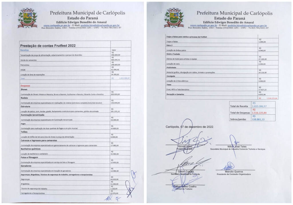 O balanço das contas da FrutFest 2022, resultou saldo positivo, ou seja, todas as despesas da festa foram pagas com as receitas da própria festa e ainda sobrou um saldo positivo.