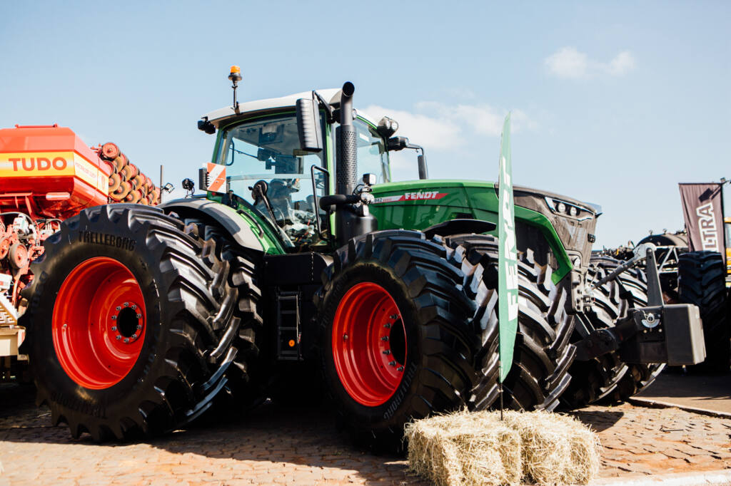 Dentre os que chamam a atenção de quem passa pela feira está o trator modelo 942, da marca alemã Fendt, que atrai olhares pelo tamanho e desenho, bem diferente do convencional. O valor impacta ainda mais: 2 milhões e 800 mil reais. O estande tem máquinas muito grandes.